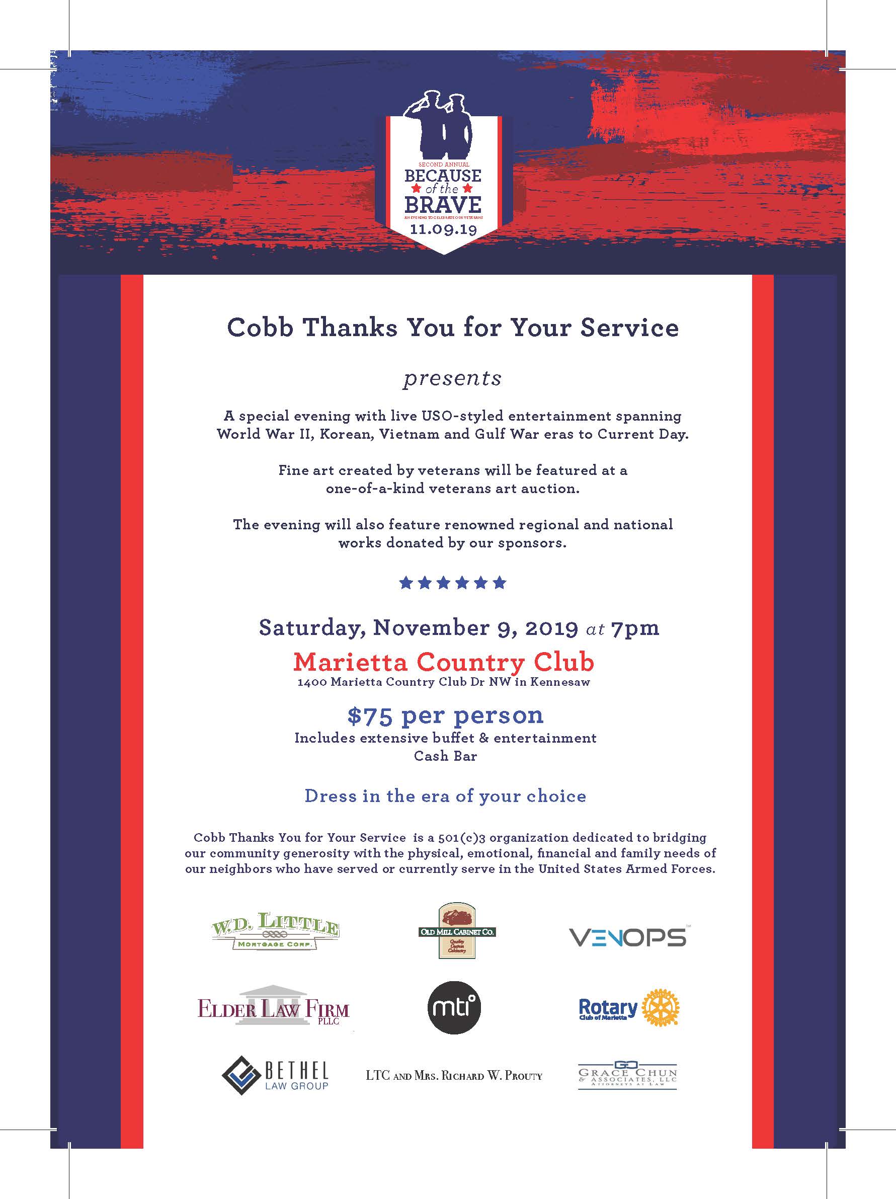 In 2019, RCoM sponsored and provided financial support for the 2nd Annual Because of the Brave Veteran's Day Celebration. RCoM members helped in the planning and execution of a gala held on November 9, 2019. Proceeds from the event were used to fund special programs for Veterans on hospice care, Cobb Superior Court's Veterans Accountability Court and to fund a new account with Chattahoochee Technical College to assist Vets with job skills training and educational support.